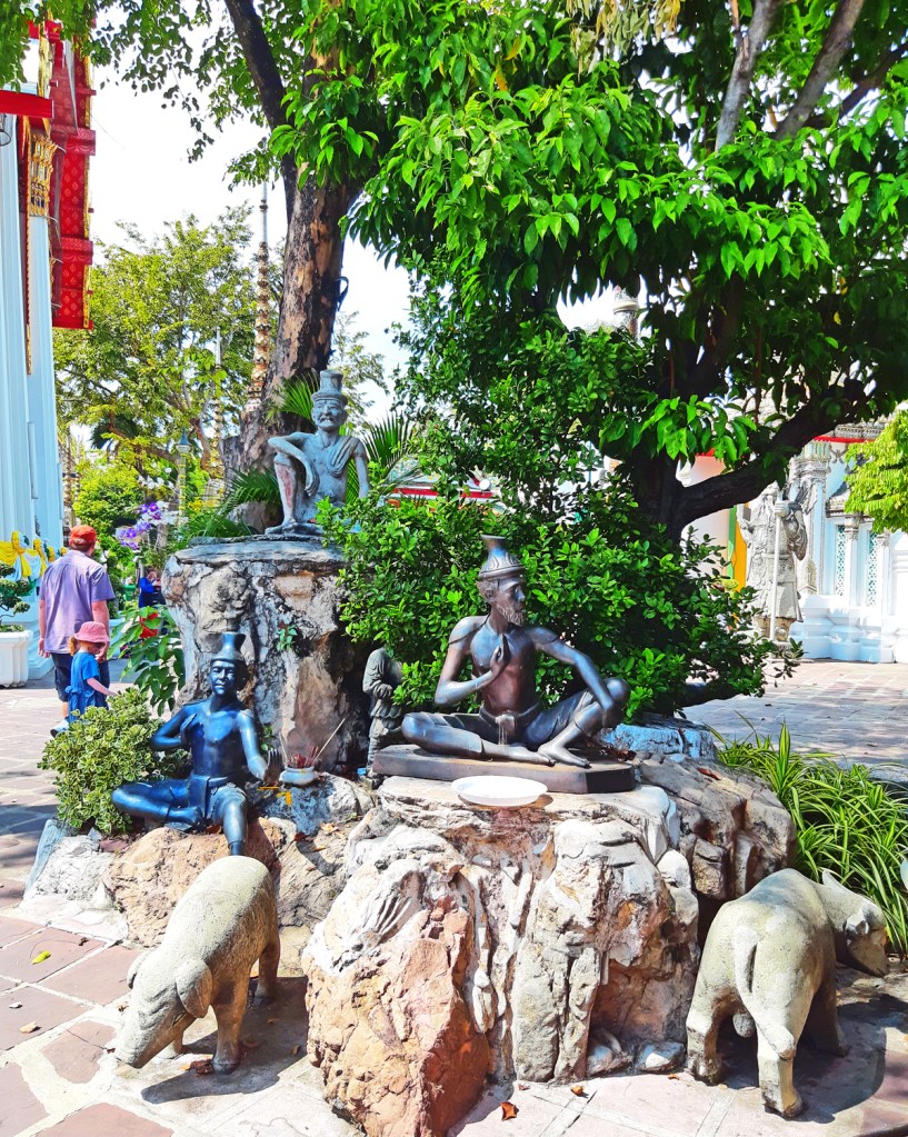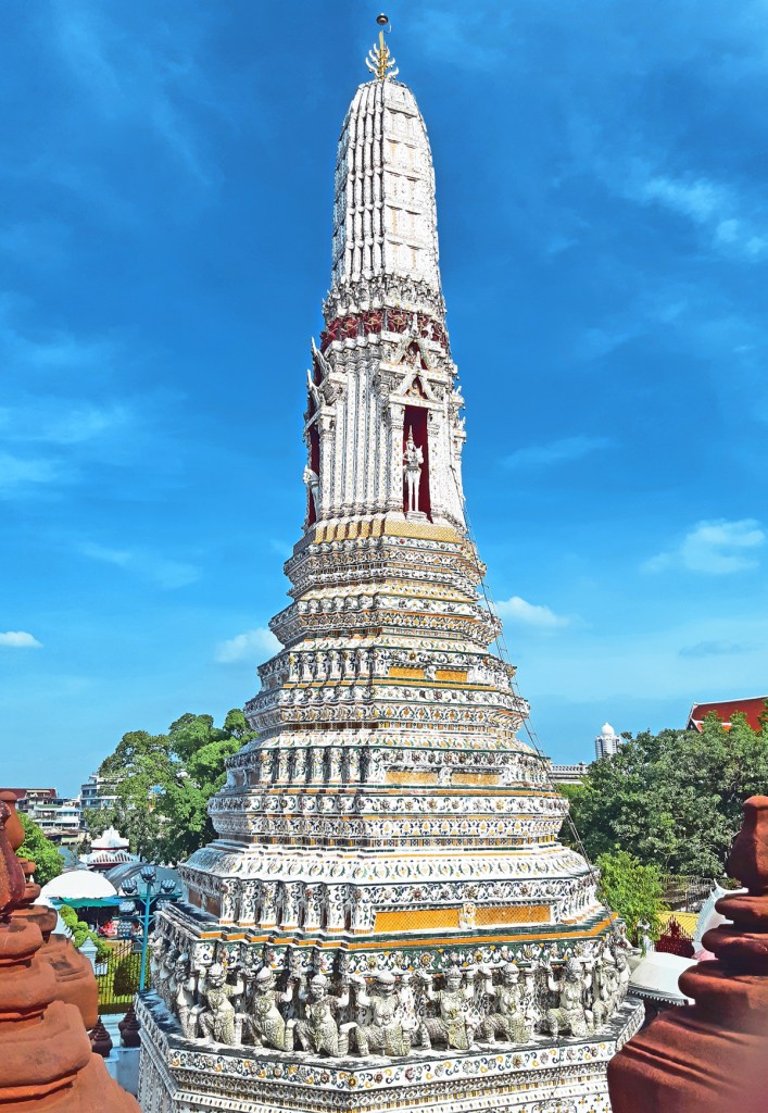 Wat Pho is the famous temple of the Reclining Buddha. Among the crowded tourists and performance of Buddhist songs by young Thais, we walked around the temple embellished in awe-inspiring spires of bell-shaped stupas made of intricate colorful carvings. Similar to designs of other temples in the Grand Palace, the roof of Wat Pho is also multi-layered, colourful, gilded, and rough at the edges. It houses the enormous statue of the Reclining Buddha, which extends from one end of the temple to the other. Its magnificent size is captivating. On another side of the temple are the standing images of Buddha’s top disciples (Arhants).