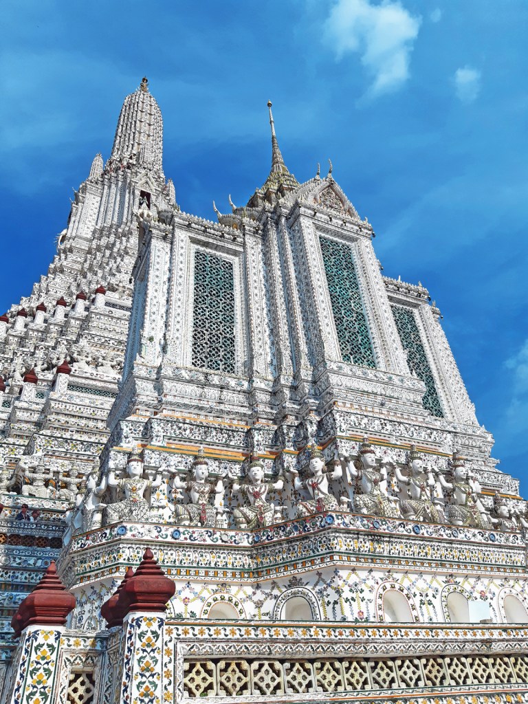 The central tower is about 86 metres tall and surrounded by small bell-shaped stupas. One remarkable feature of the temple is its intricate carvings on white marble and porcelain, each layer more detailed than the last. The concentrated focus involved in the painting and design of Wat Arun reminds one of Buddhist monks who create and colour sand mandalas as part of a meditative exercise.