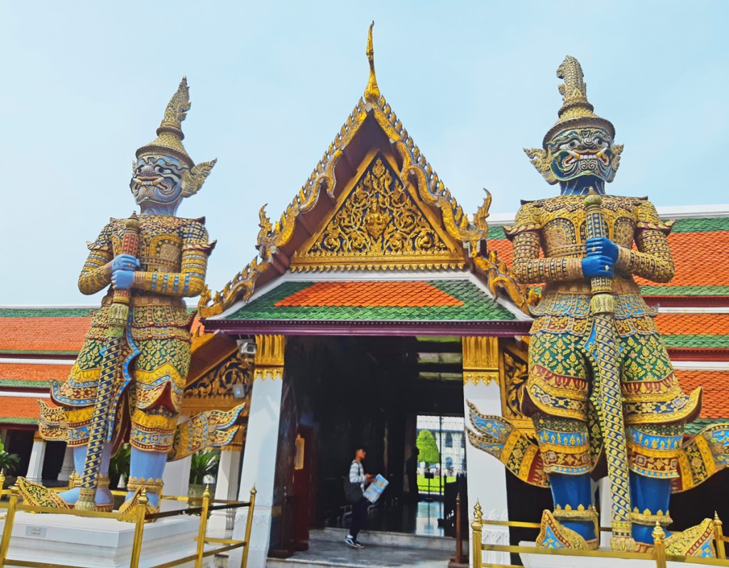 The Buddha statue inside was carved from a single block of emerald stone. In the presence of palace guards, the queue to enter the temple was long but quiet and disciplined. Only the King is allowed to touch the Emerald Buddha. The King changes the gold cloth of the Buddha during auspicious Buddhist occasions in front of blessing and chanting monks. During such royal ceremonies, the temple complex remains closed to visitors.
